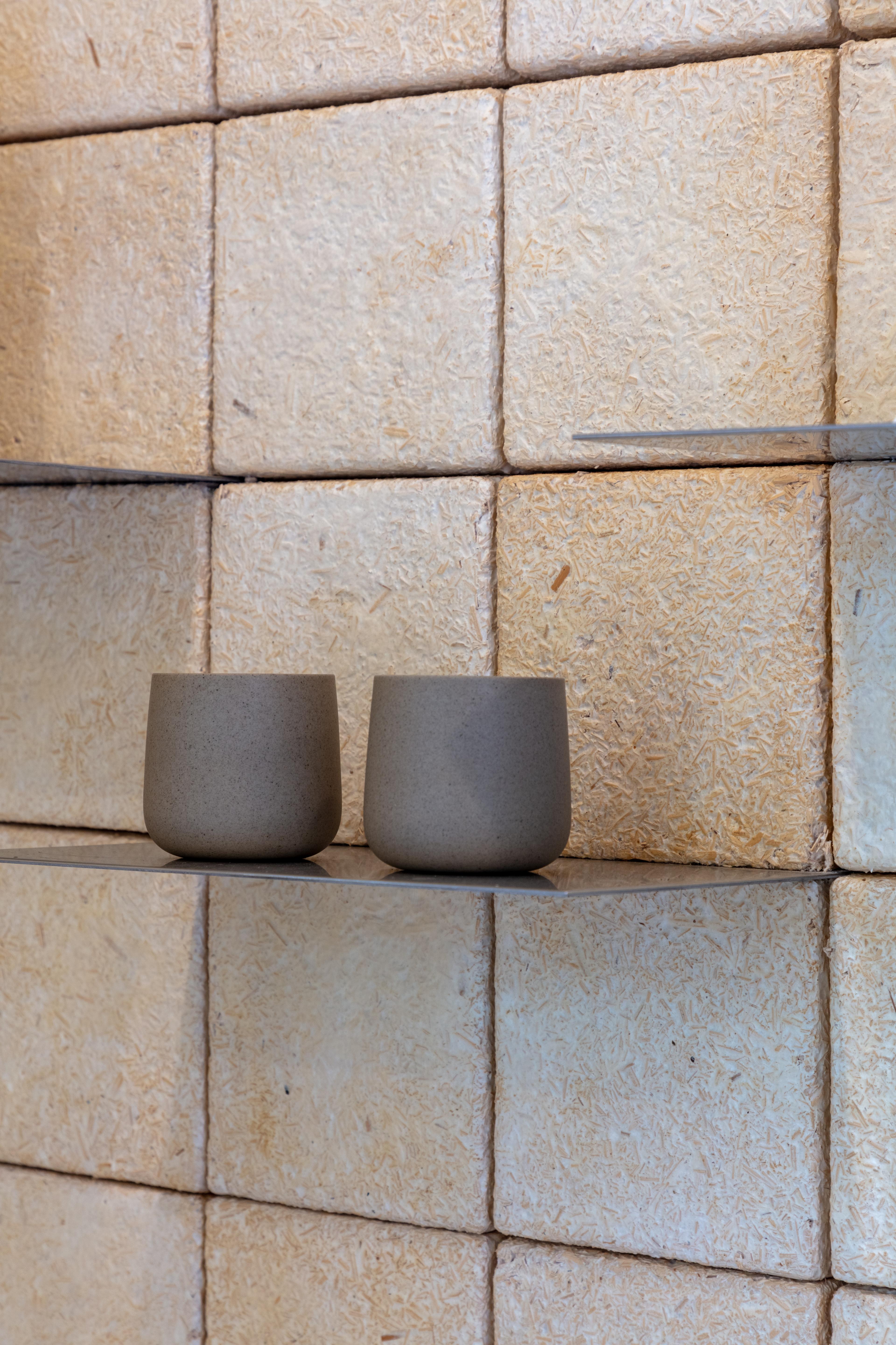 We decided to use a material that we had recently become familiar with at the last Venice Biennale: mycelium panels grown from mycelium (a fungus!). These panels are one of the most sustainable materials available today. We used the panels in the interior walls of the coffee house, made tables out of them (inspired by the shape of the mushroom) as well as street lamps.