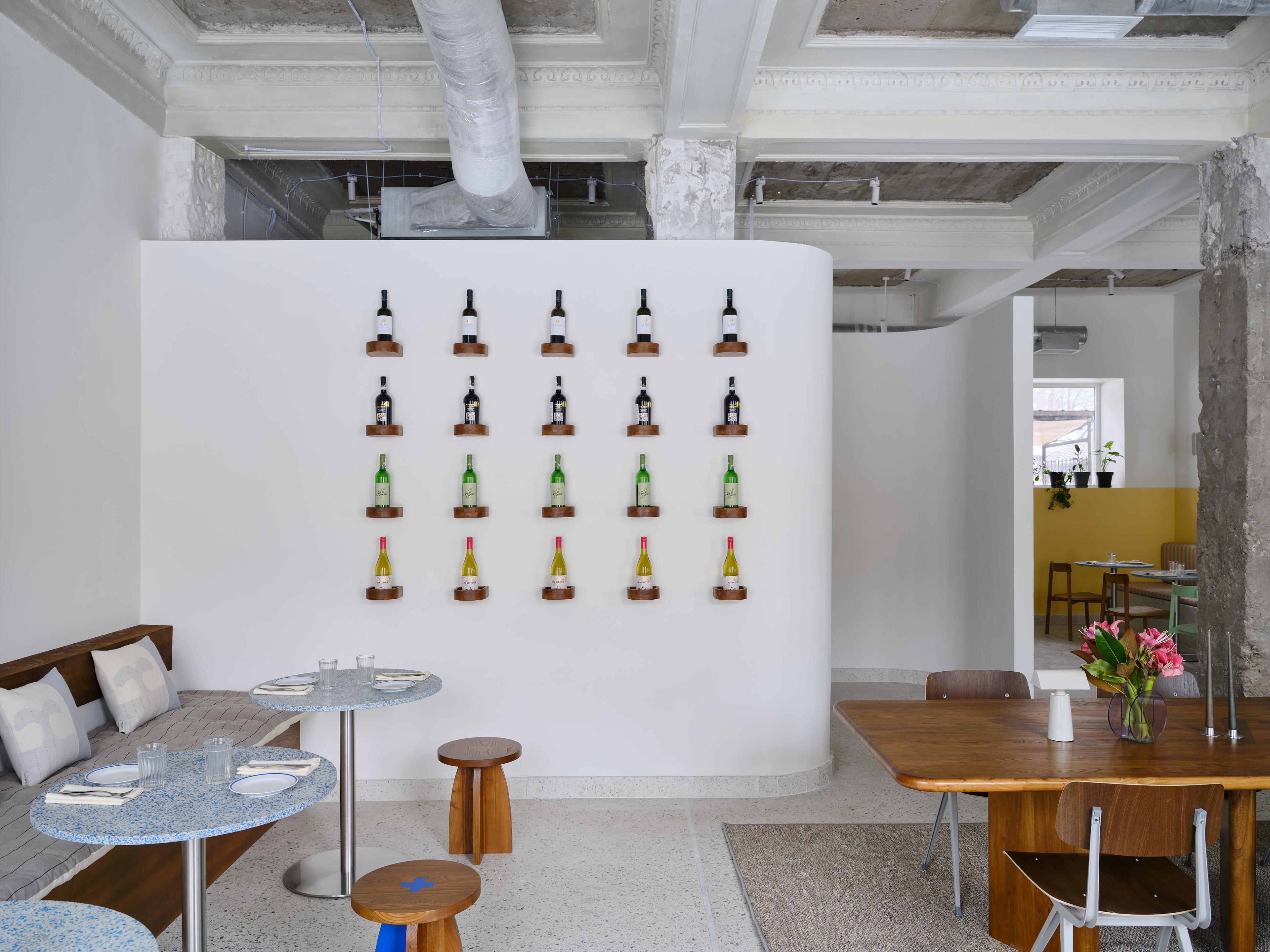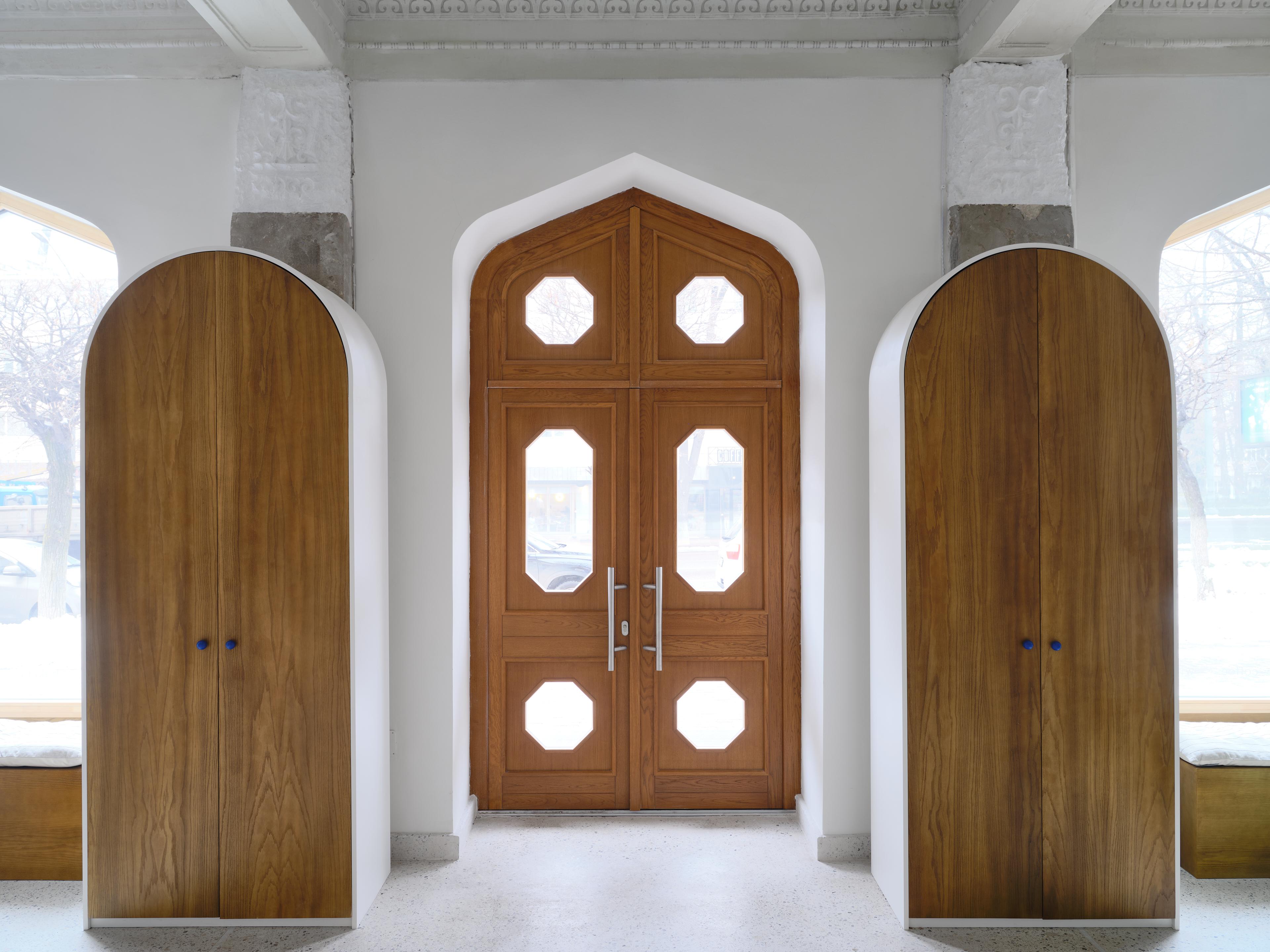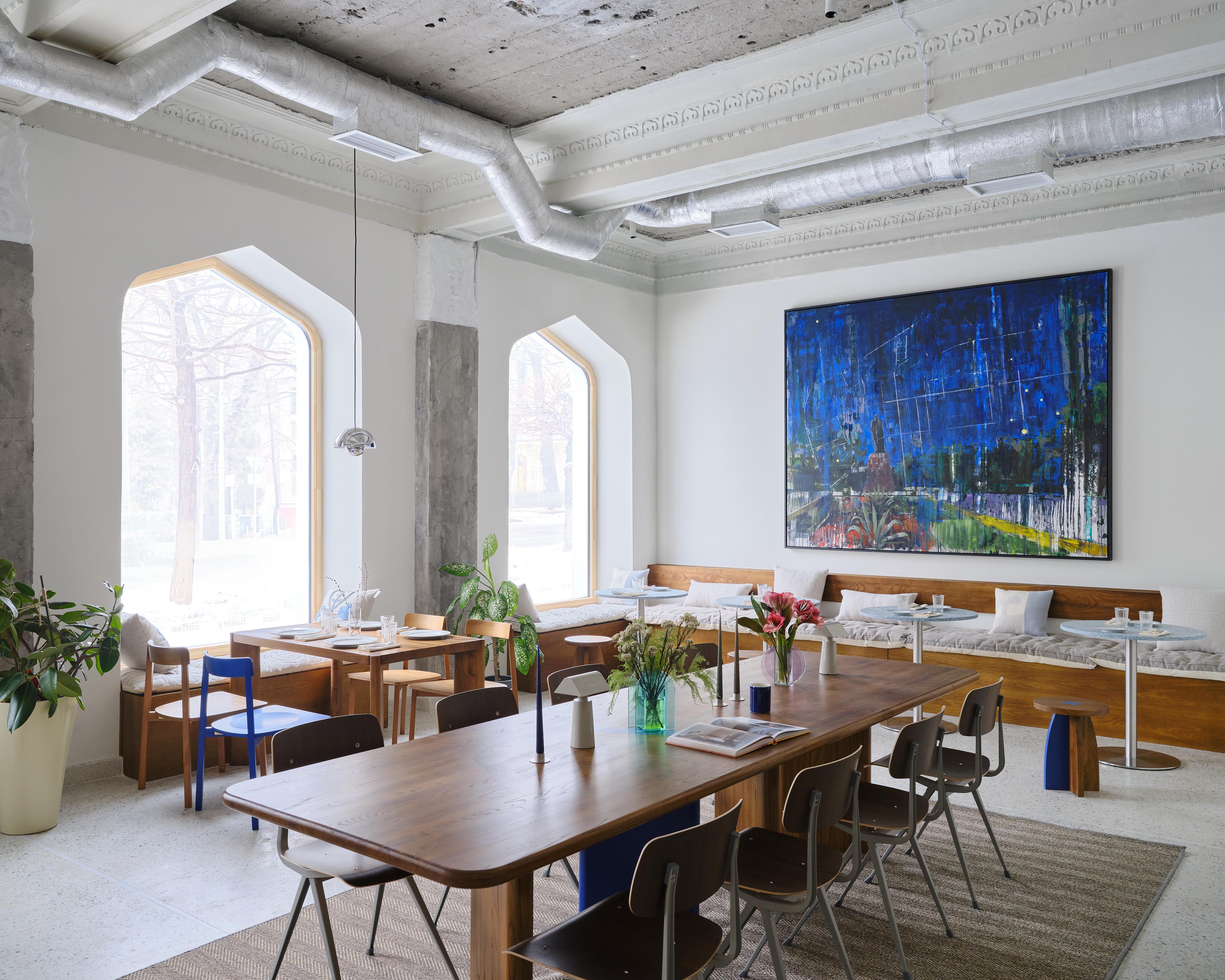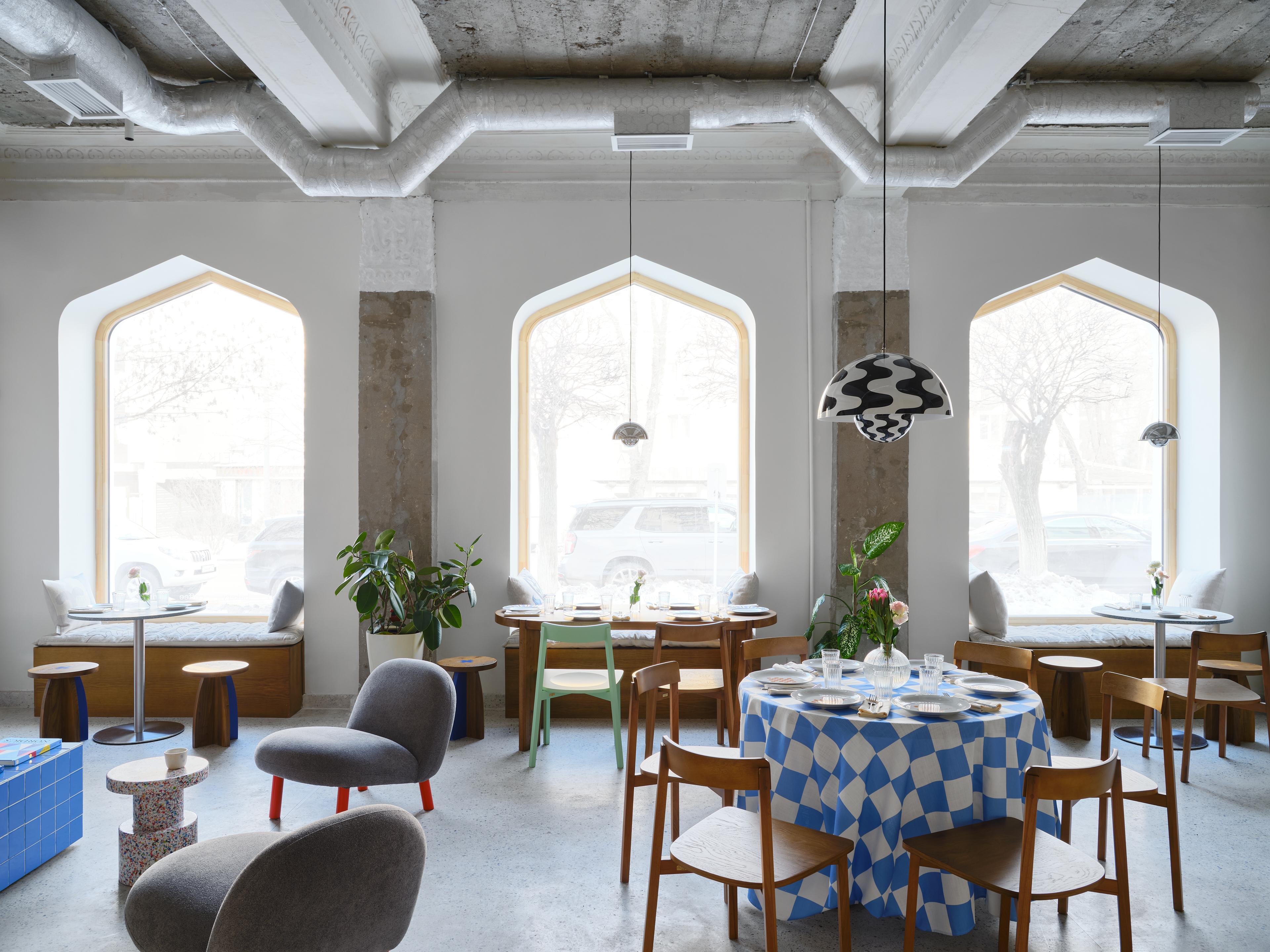 The main seating area of the restaurant is situated along large arched windows, where we place cushions and pillows from the Kazakhstani brand Yourta @theyourta on the windowsills to create a cozy seating arrangement.