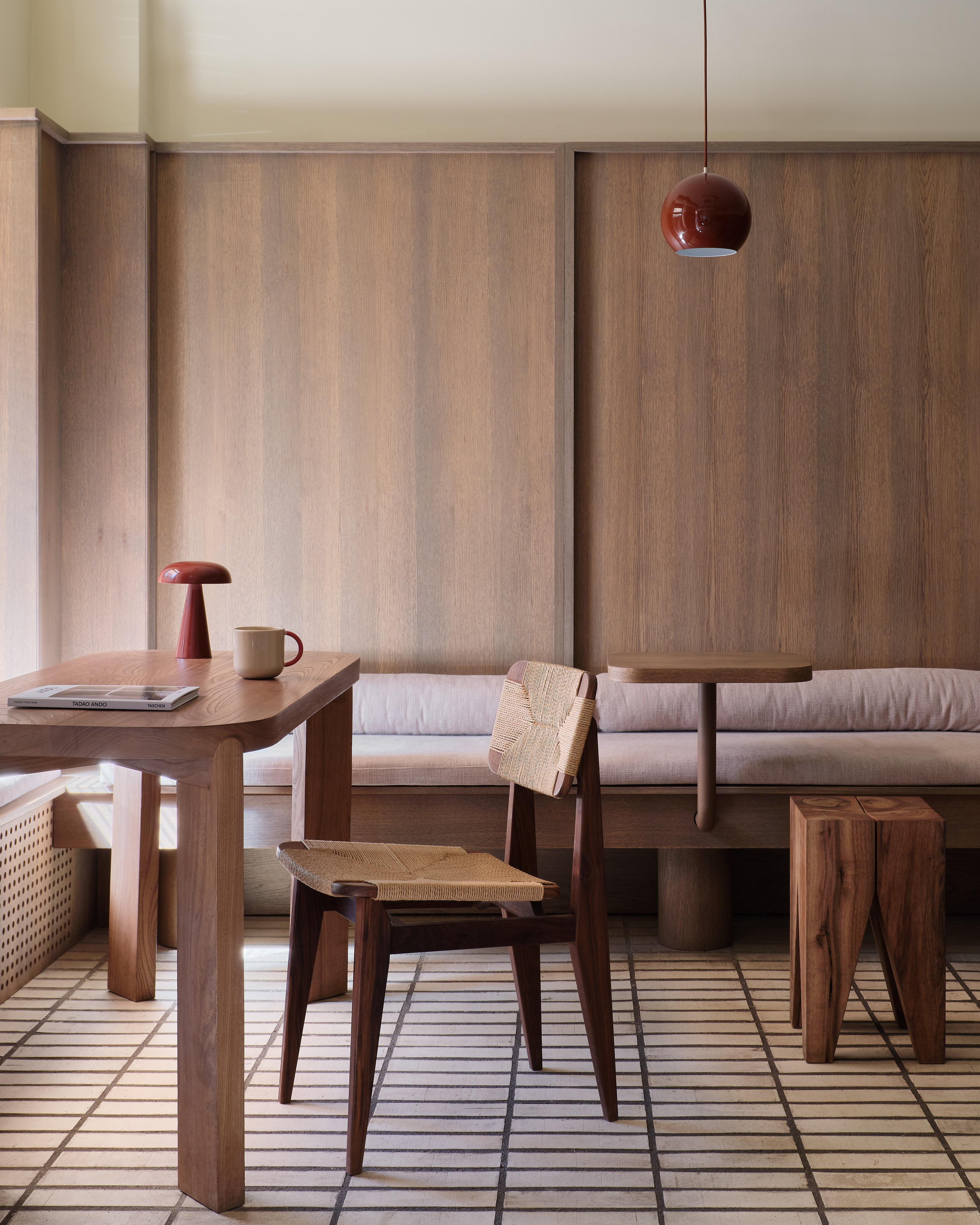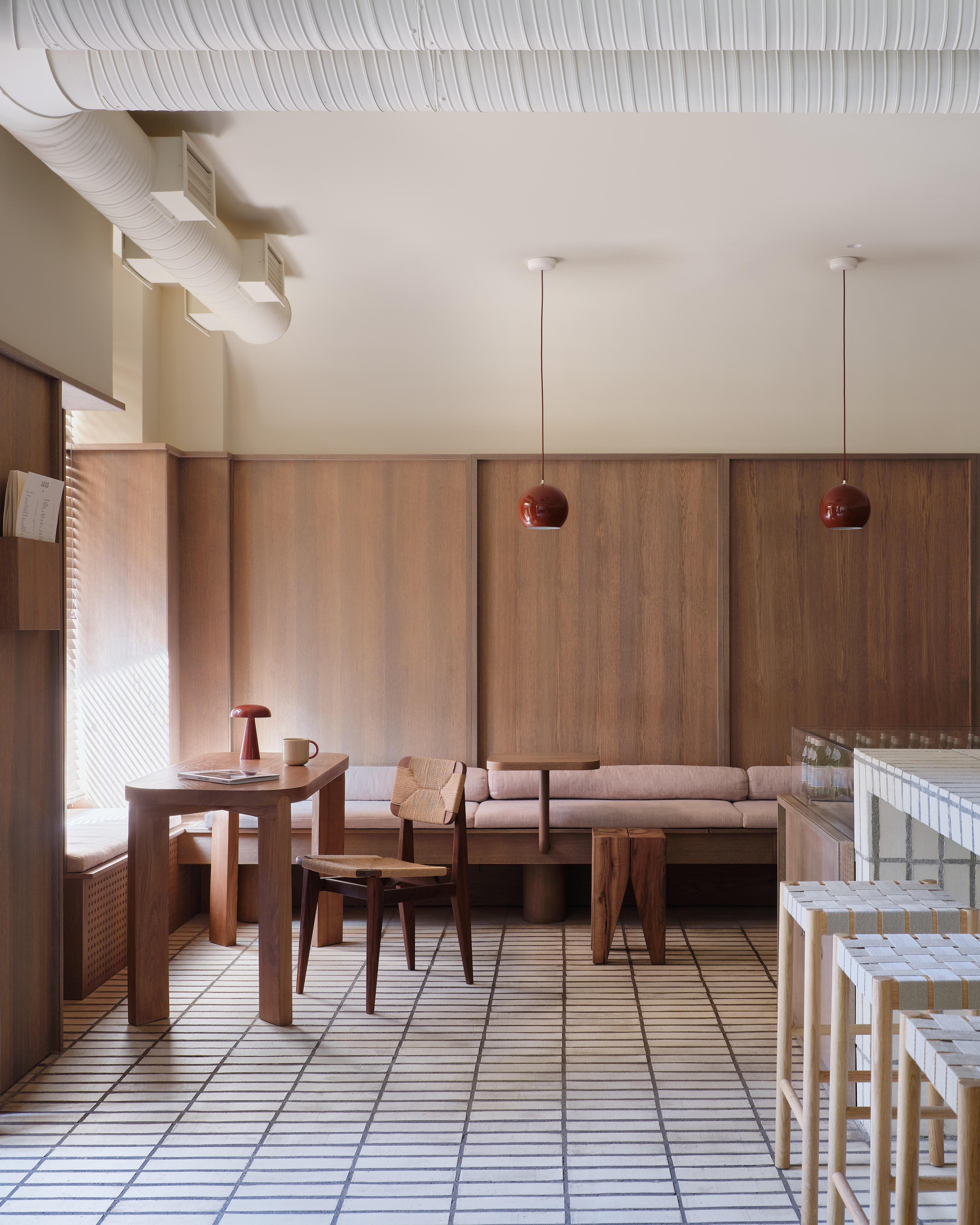 The desire to turn this small space into a little "coffee sanctuary" led us to the chamber-like, coffee-and-milk colored wood paneling, ceiling vaults, and brick floor transitioning to a bar counter. Local artist Nurbol Nurakhmet's charcoal sketch on the wall adds a special subtlety to the atmosphere. The contact bar gives visitors the opportunity to watch the process of brewing coffee as a performance. Danish brand Gubi chairs are used in the project, tables are made according to our design by local craftsmen.