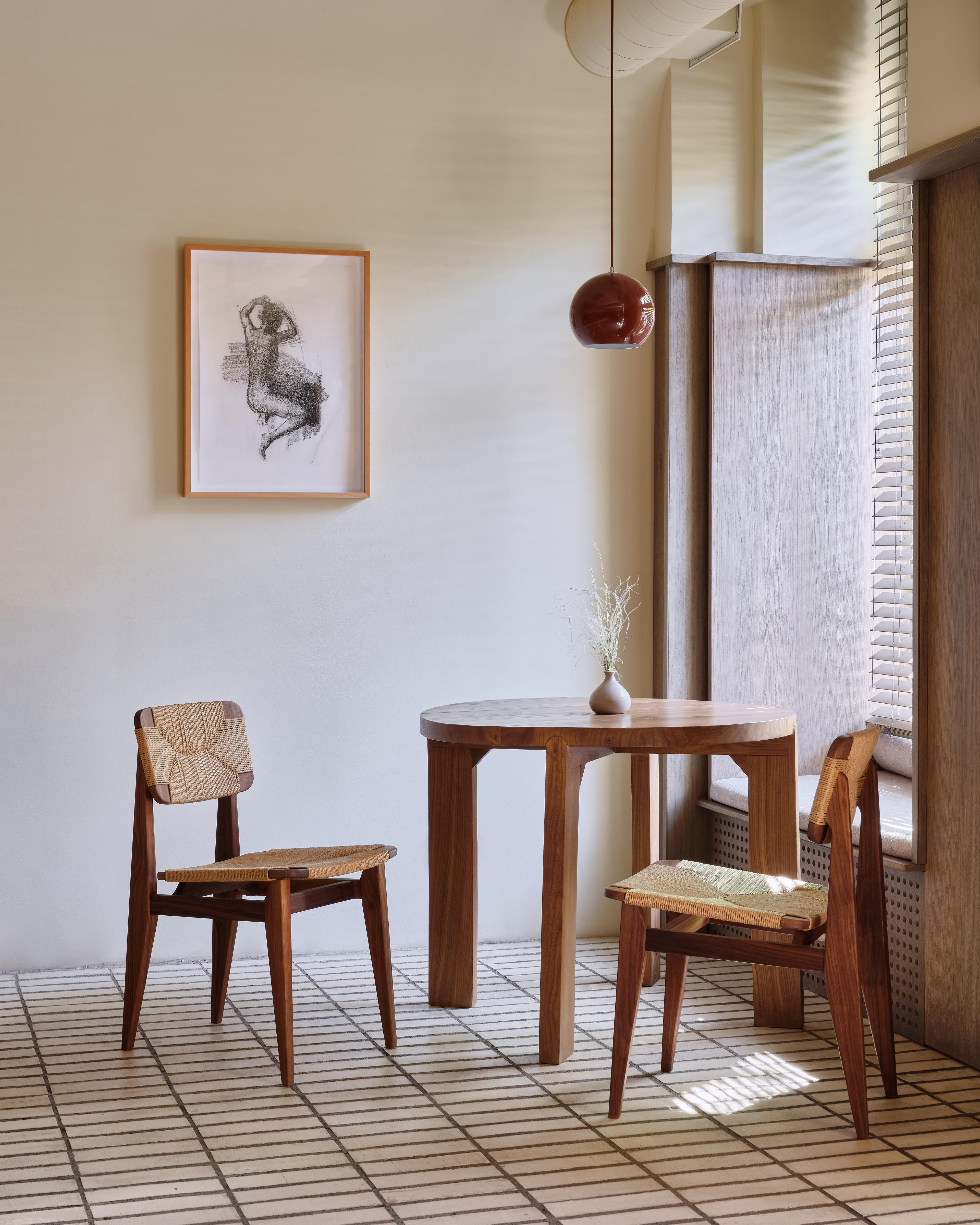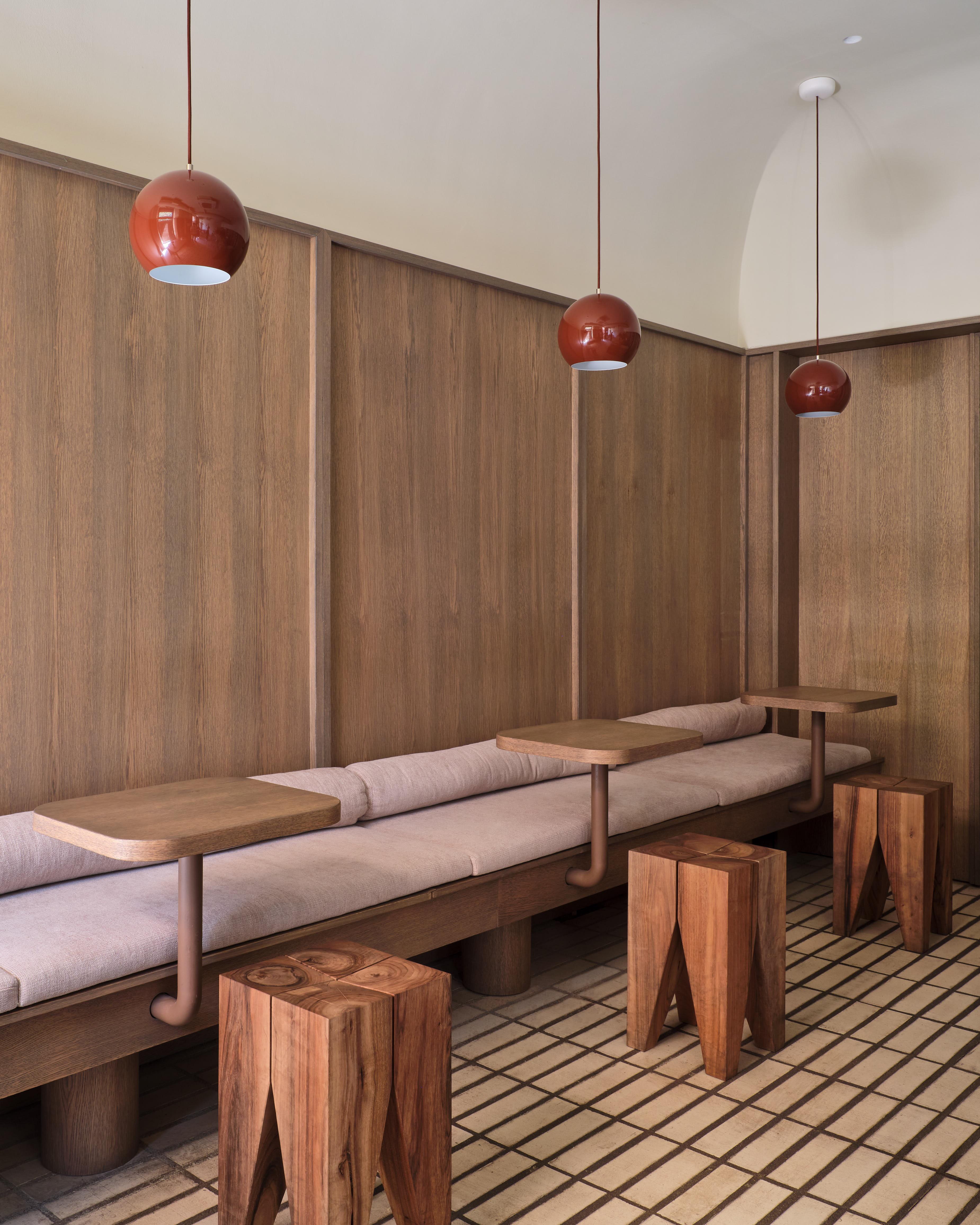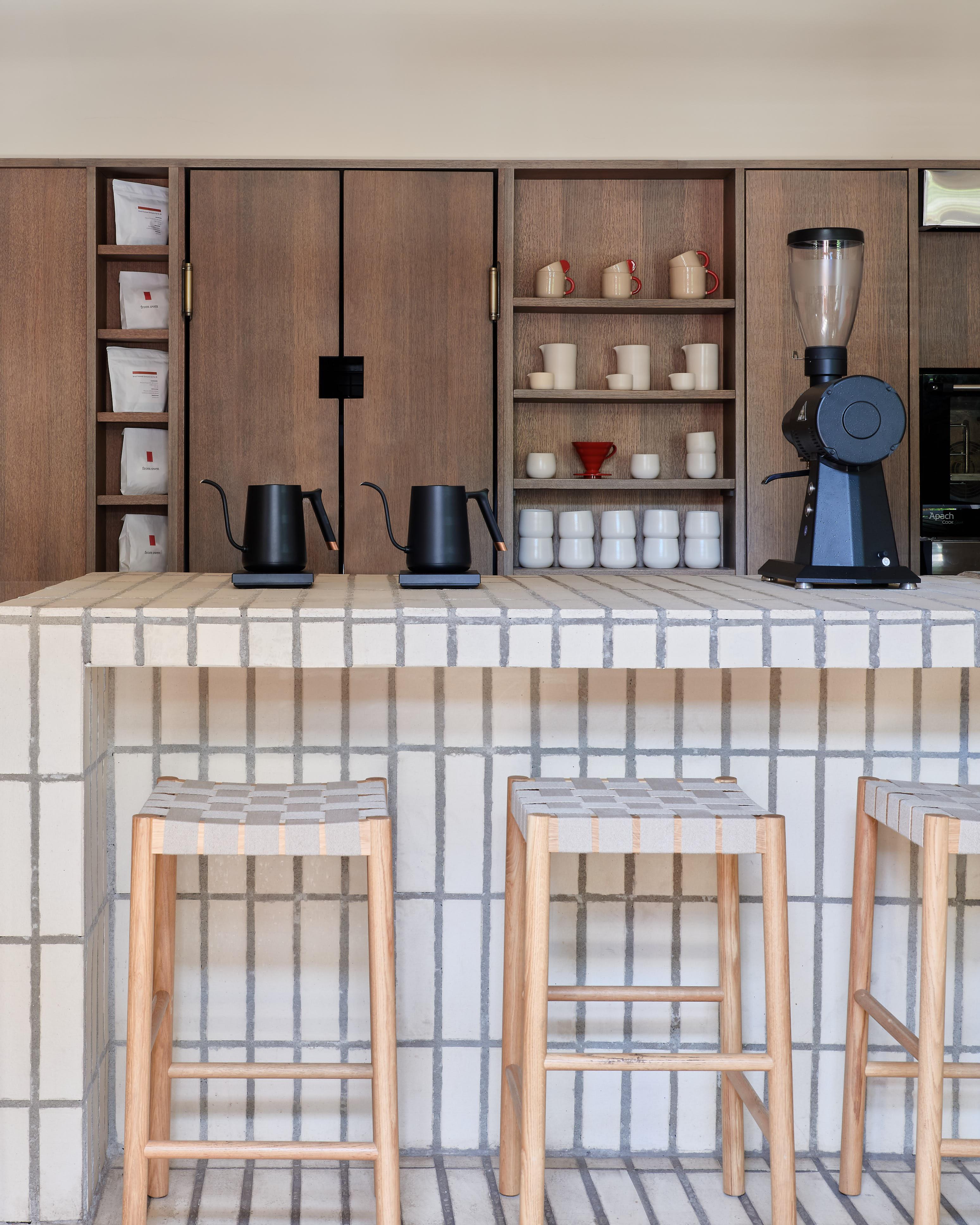 The desire to turn this small space into a little "coffee sanctuary" led us to the chamber-like, coffee-and-milk colored wood paneling, ceiling vaults, and brick floor transitioning to a bar counter. Local artist Nurbol Nurakhmet's charcoal sketch on the wall adds a special subtlety to the atmosphere. The contact bar gives visitors the opportunity to watch the process of brewing coffee as a performance. Danish brand Gubi chairs are used in the project, tables are made according to our design by local craftsmen.