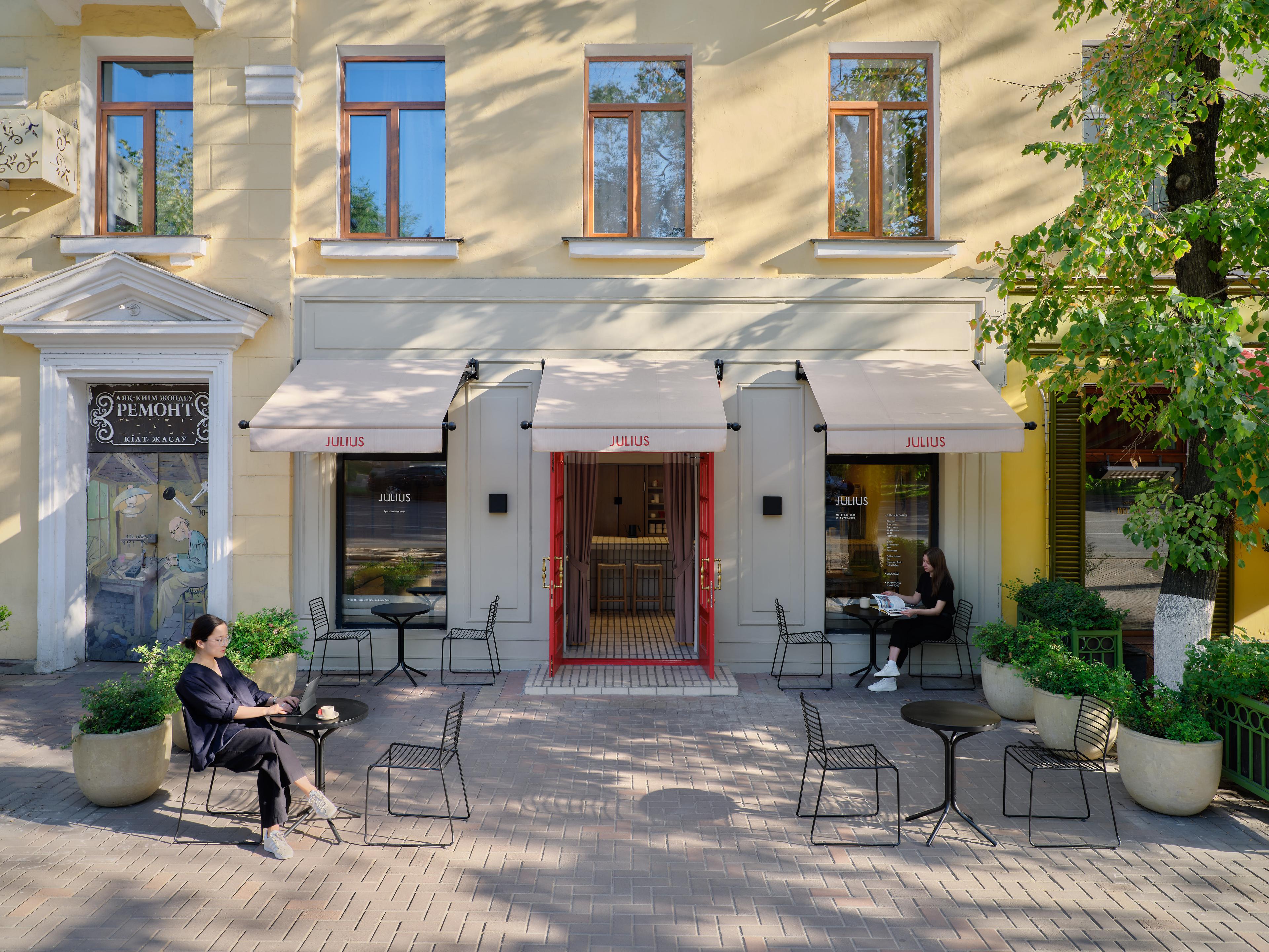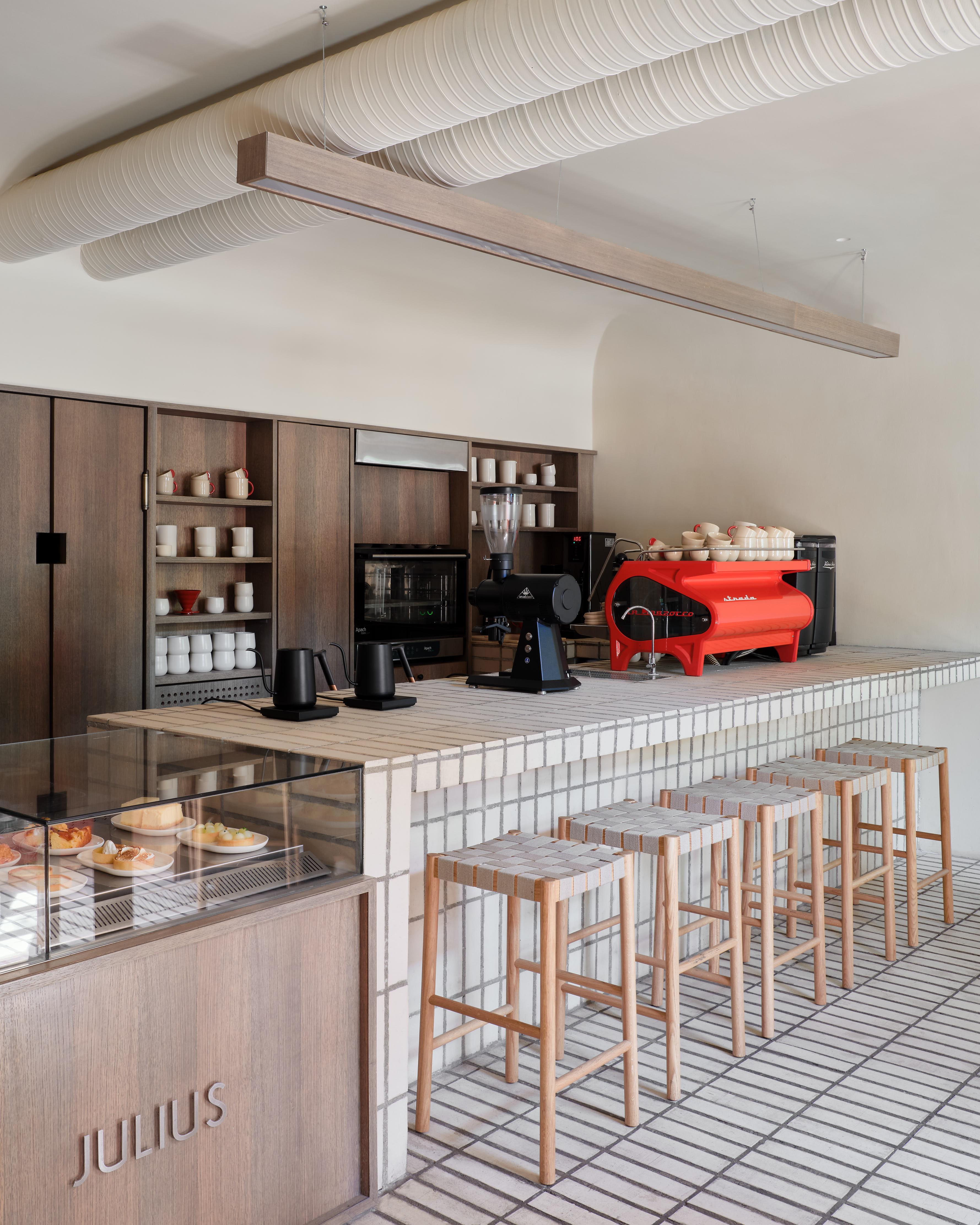 Julius is a small coffee shop in the center of Almaty. The starting point for the interior concept was a red La Marzocco coffee machine, which the customer had purchased before the project began. We thought it was symbolic to build a coffee shop interior around the coffee machine. Thus appeared the red door, which reminded us of the iconic Parisian bar Little Red Door; as well as all the other small red accents, including the logo and the identity.