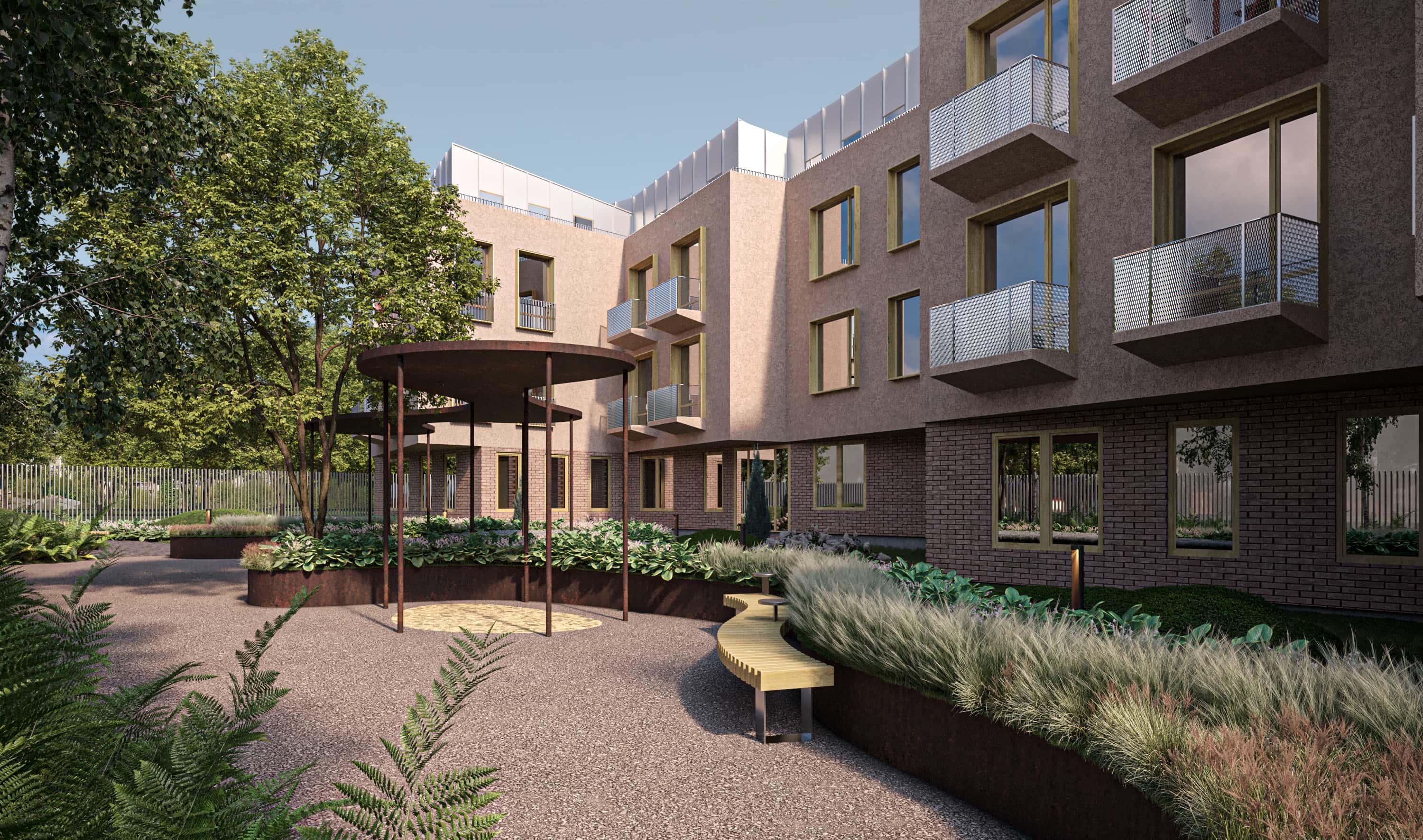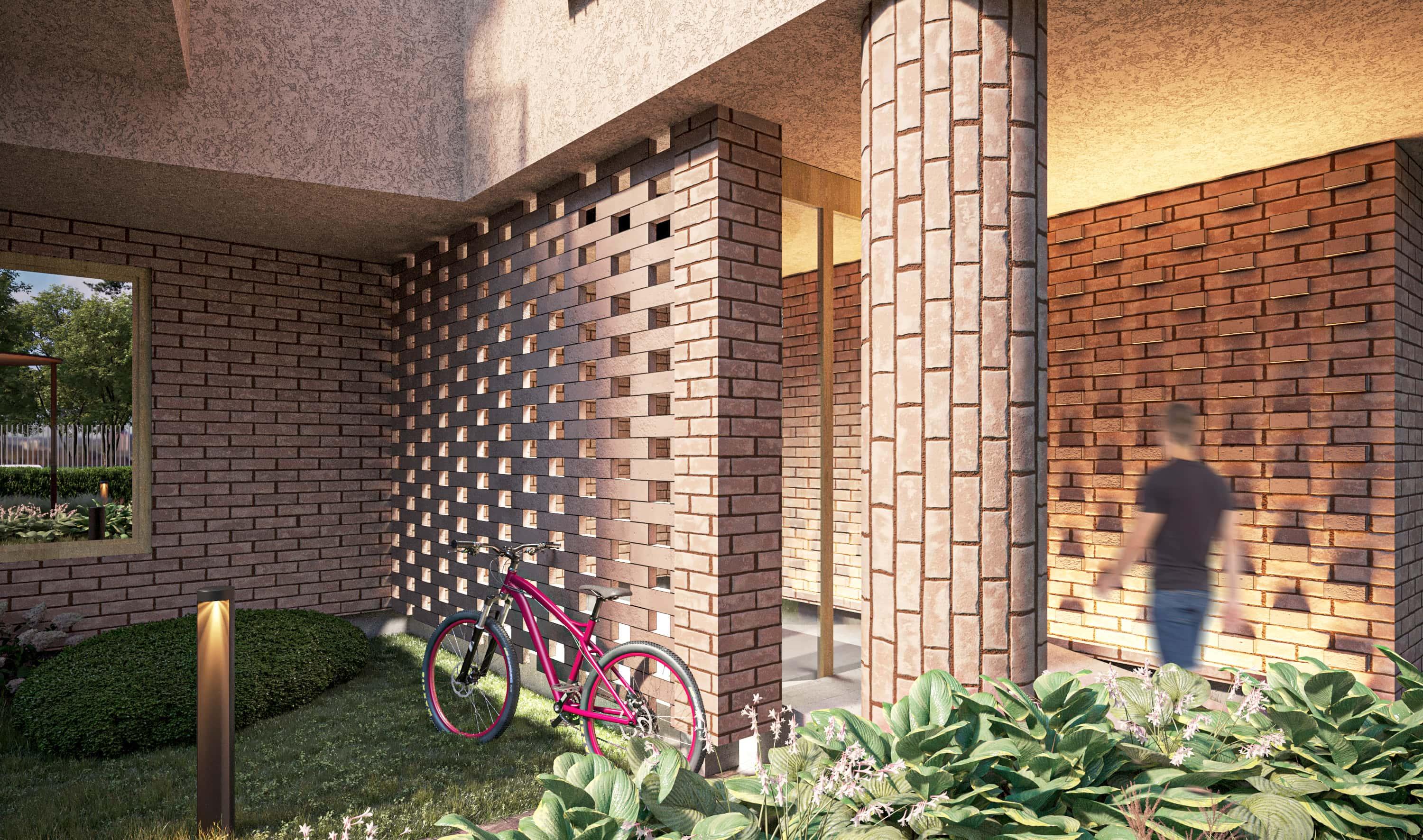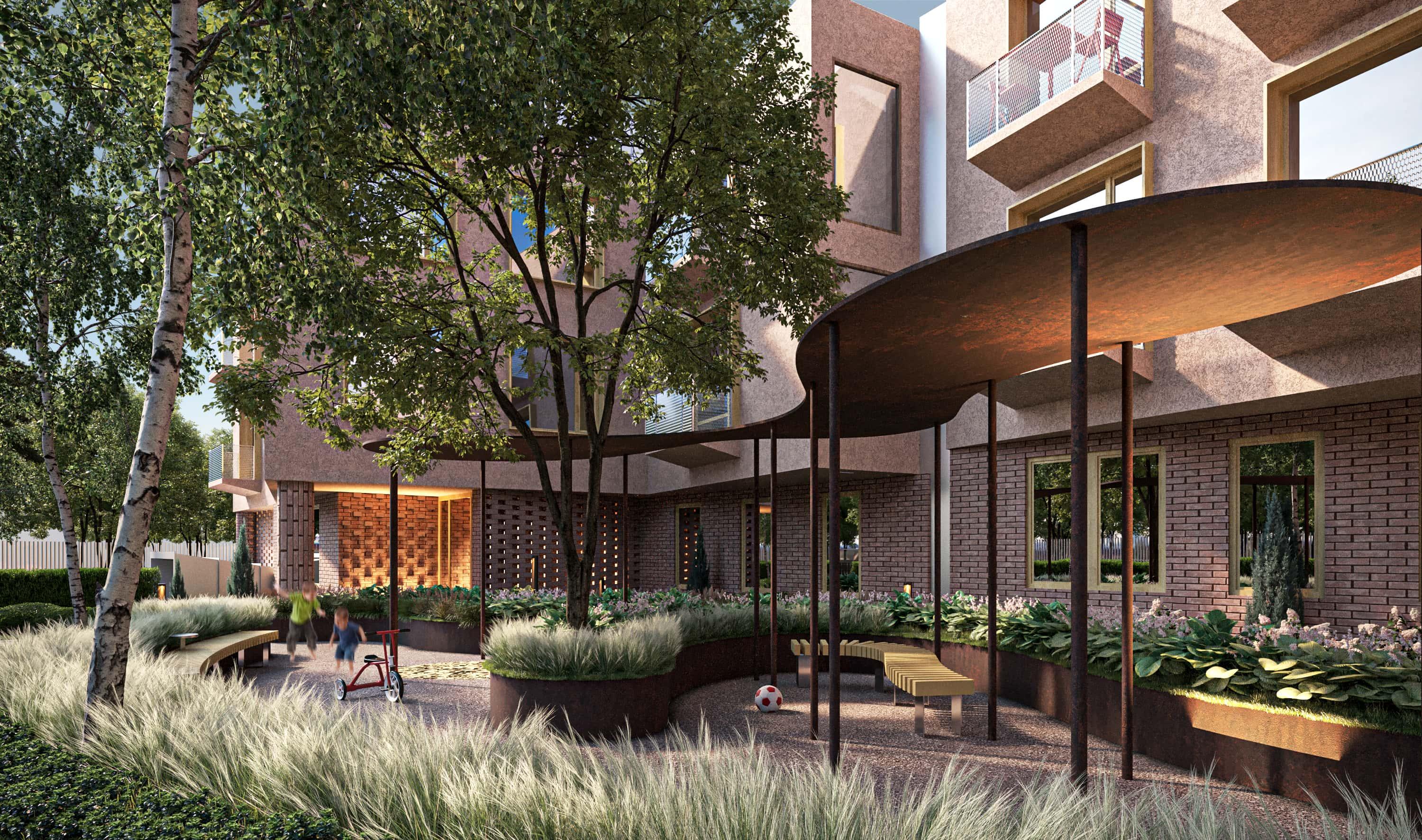 To balance the building’s straight, airtight outlines, the landscaping concept is based on organic lines and forms. The courtyards feature canopies and rusted metal flowerbeds that highlight and enhance the warm tones of the brick.