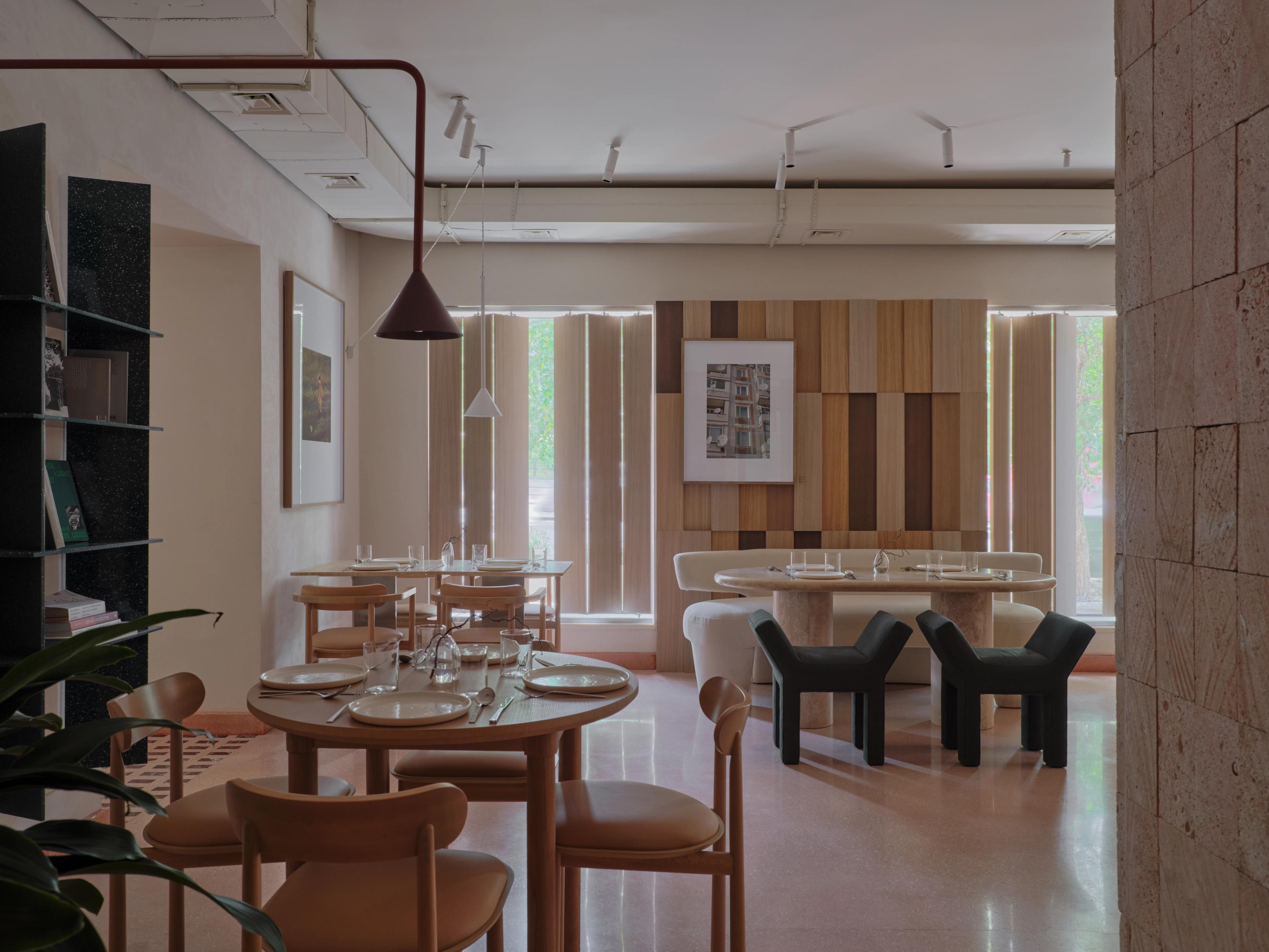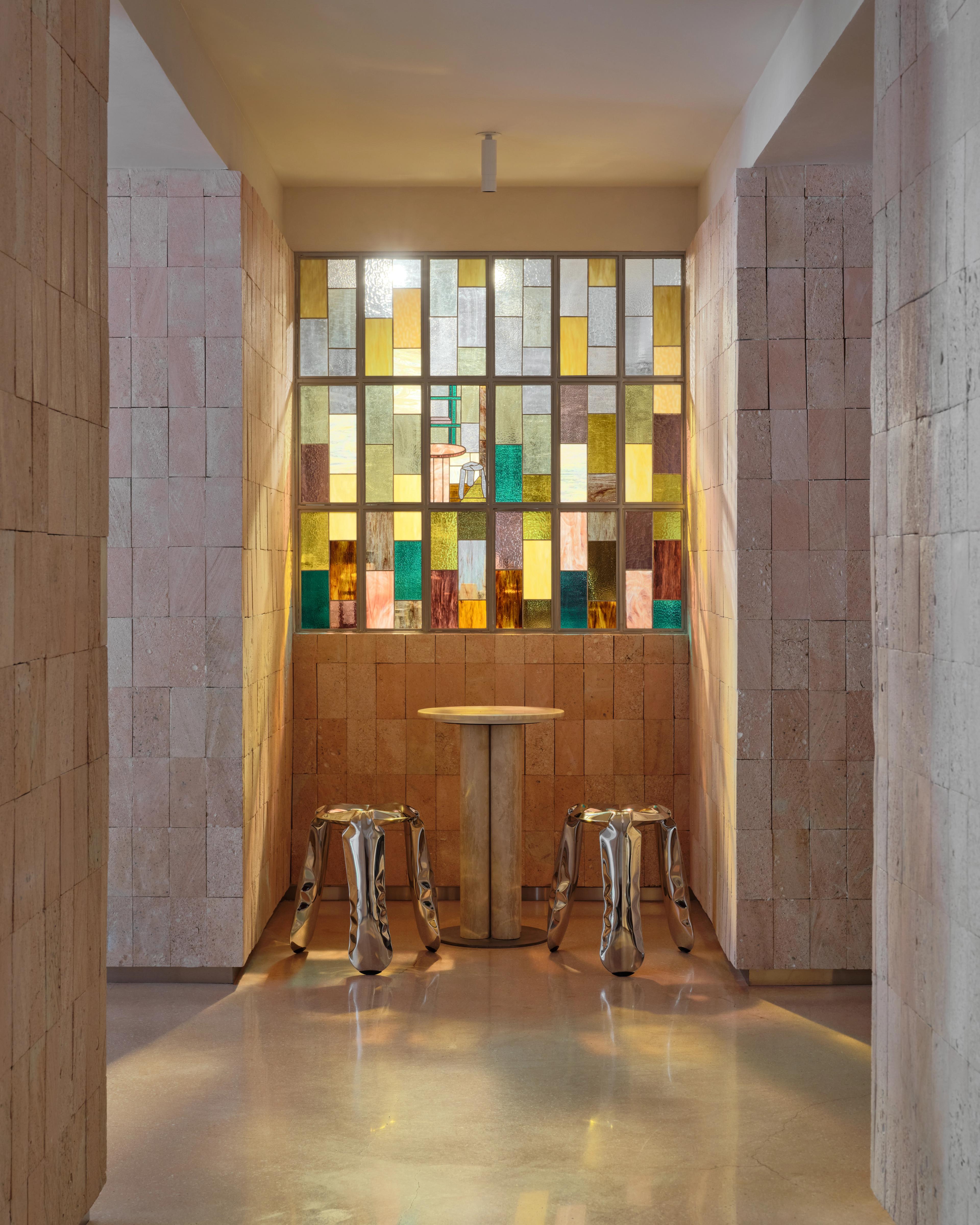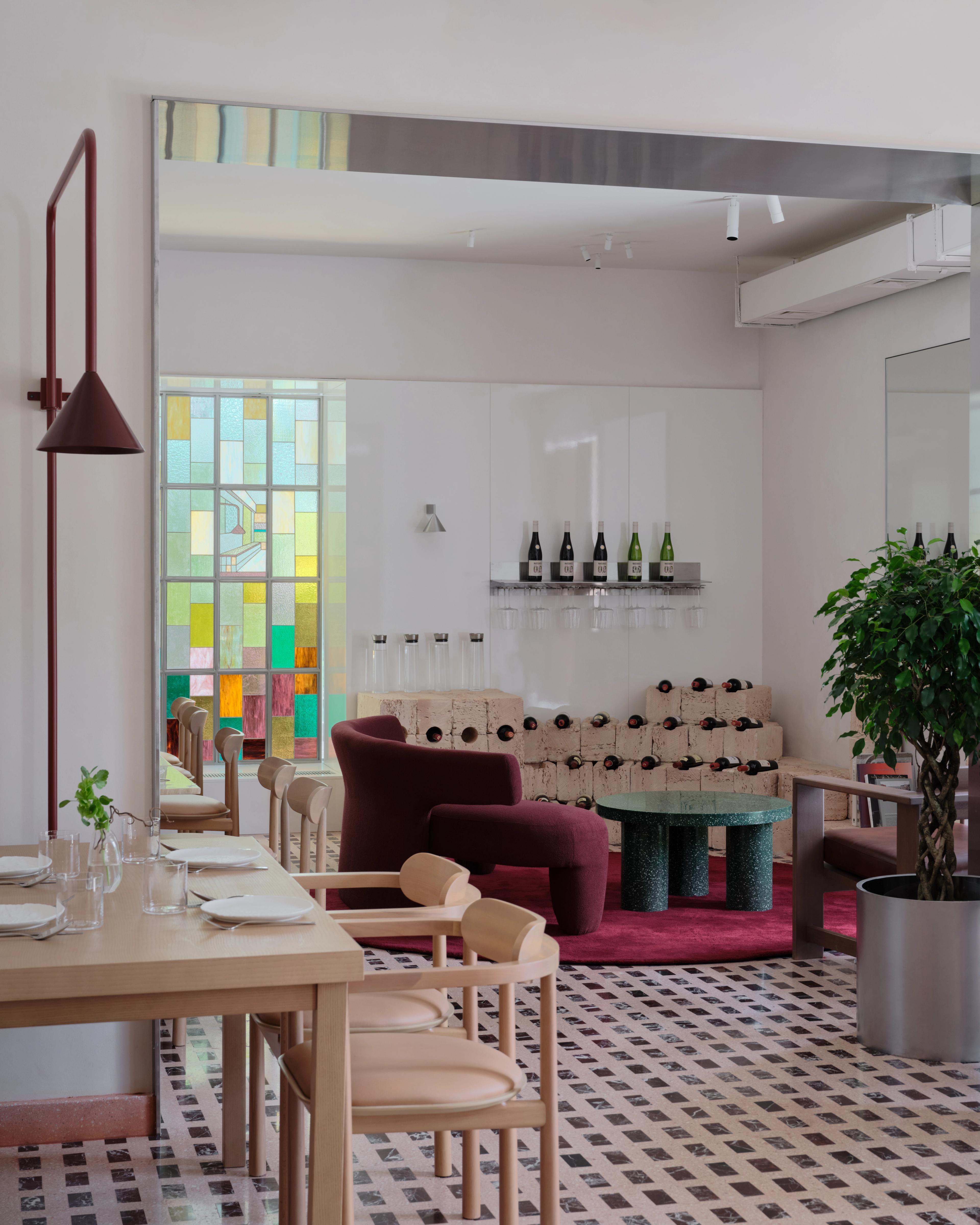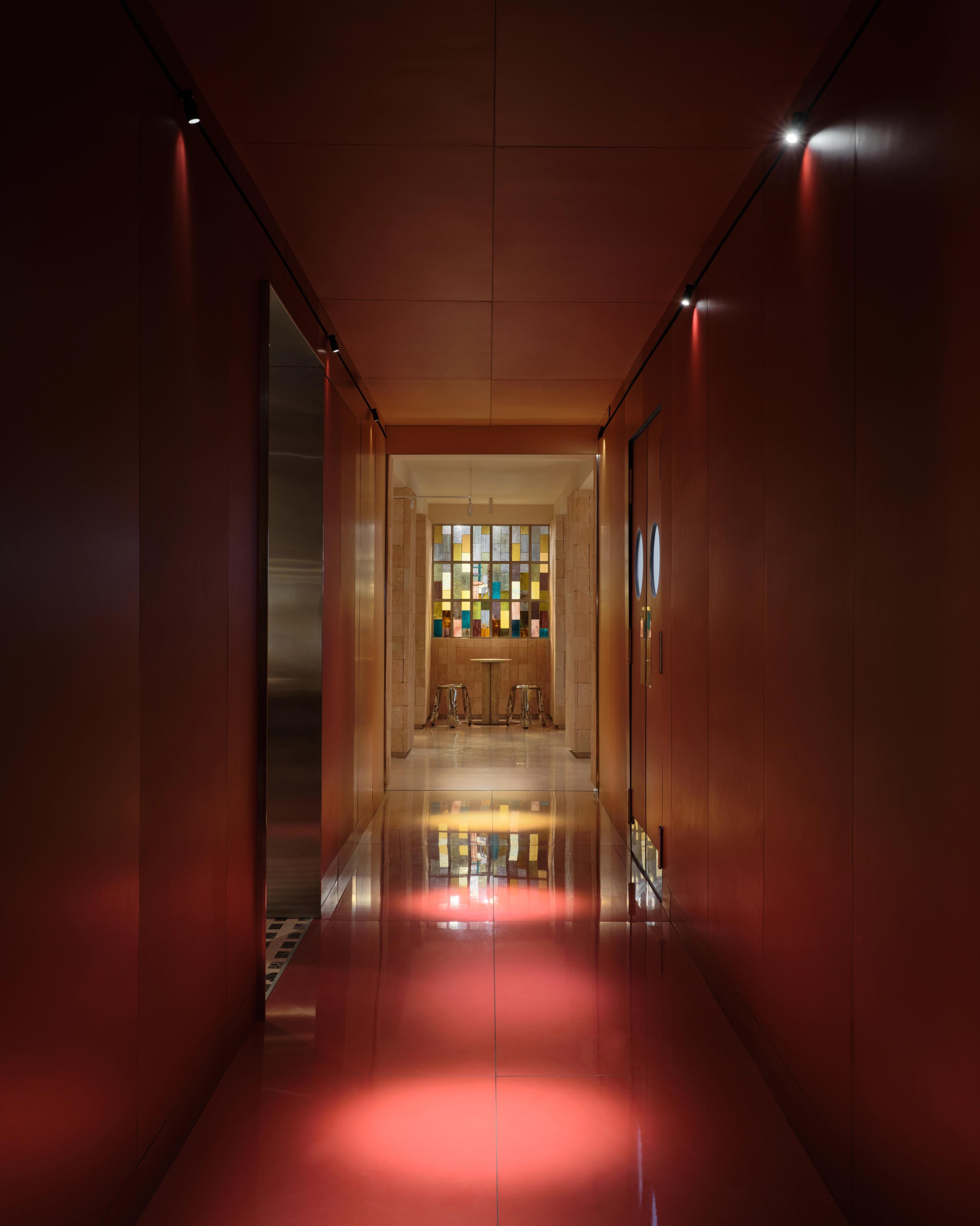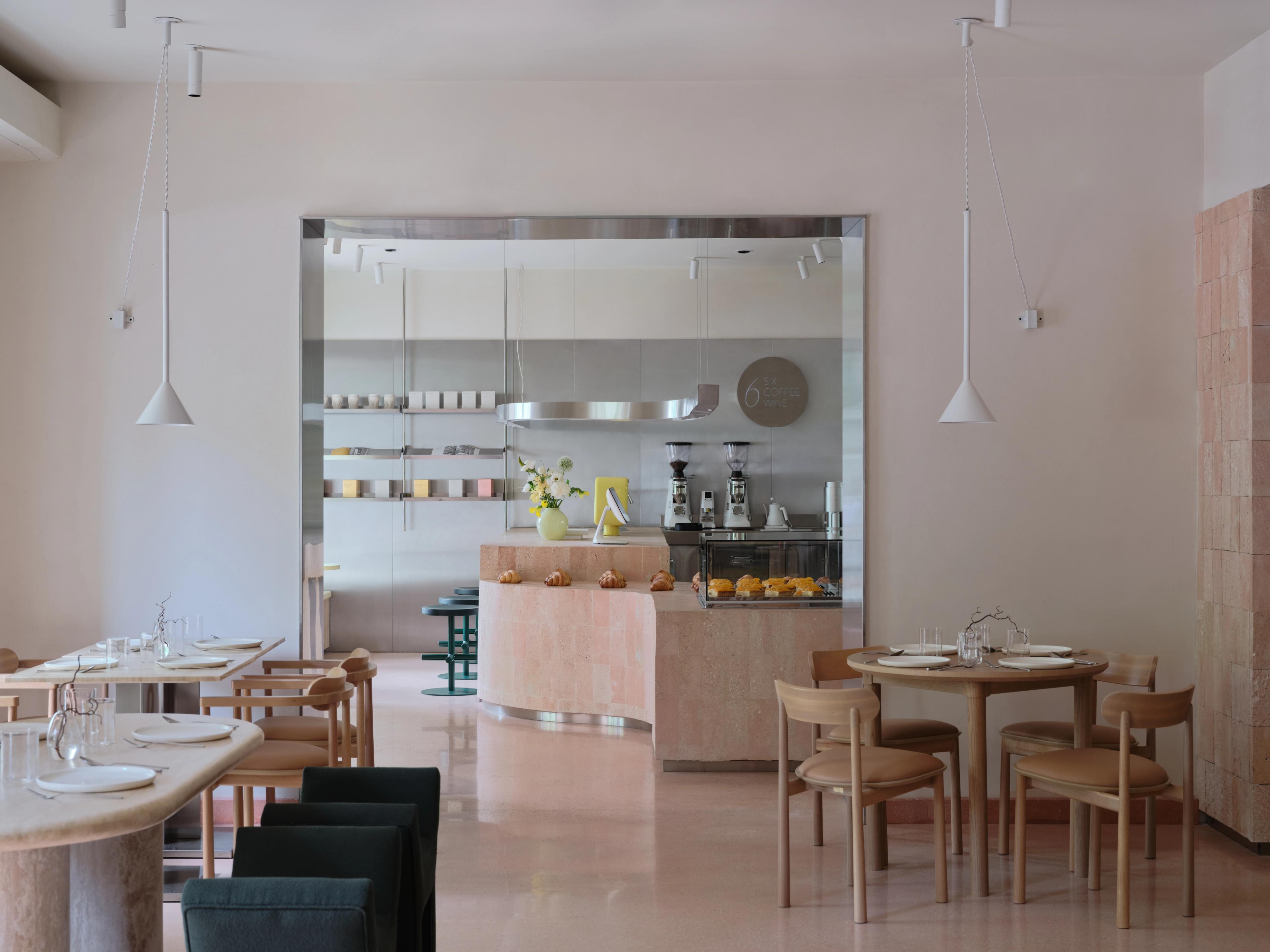 The Six Coffee + Wine restaurant is conceived as a versatile venue that seamlessly transitions from a bustling breakfast and coffee spot in the morning to an intimate winery by evening. This transformation is enabled by a meticulously planned lighting design, which adapts to create the desired ambiance, and a flexible table arrangement that shifts effortlessly between functions. Situated in a Stalin-era historical building in the heart of Almaty, the interior design pays homage to Soviet architectural traditions. Limestone cladding, terrazzo flooring, and a bespoke stained glass window crafted by a local artisan evoke the iconic aesthetic of the period, grounding the space in its cultural and historical context. A standout feature is the gradient wall panels in the corridor, a creative collaboration between the NAAW architectural studio and local furniture manufacturer Free-Style. This installation adds a dynamic, contemporary layer to the design, juxtaposing tradition with modern touch.