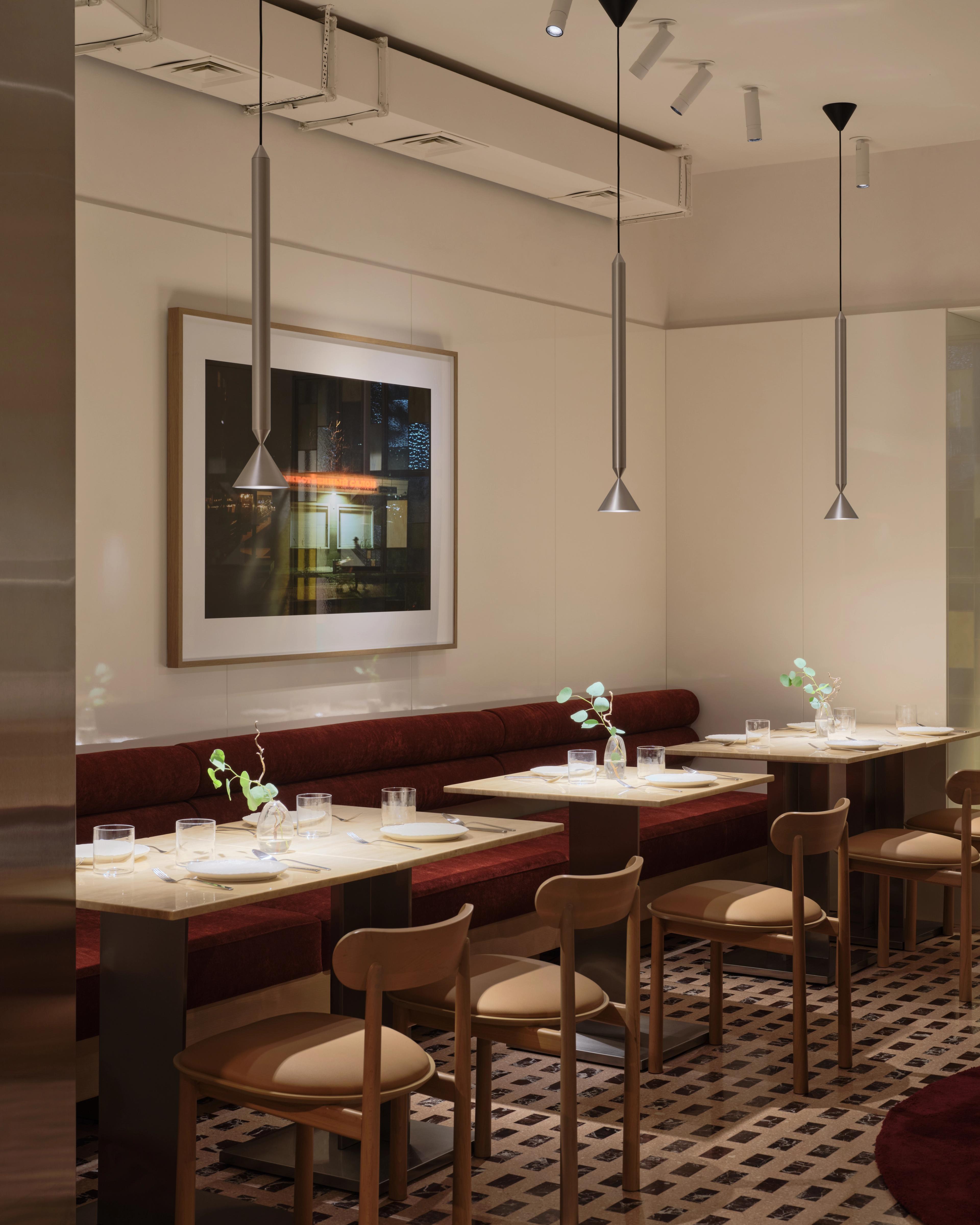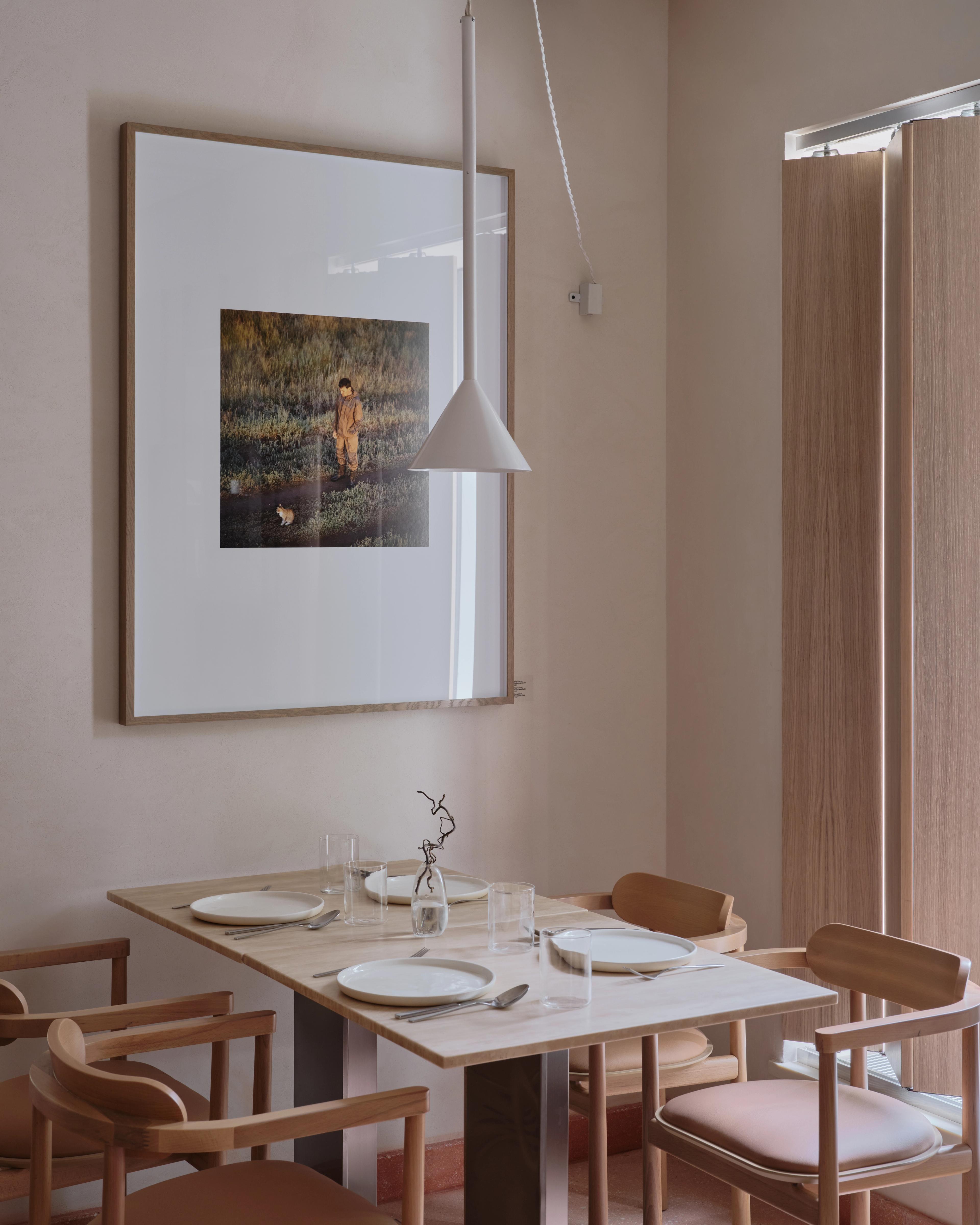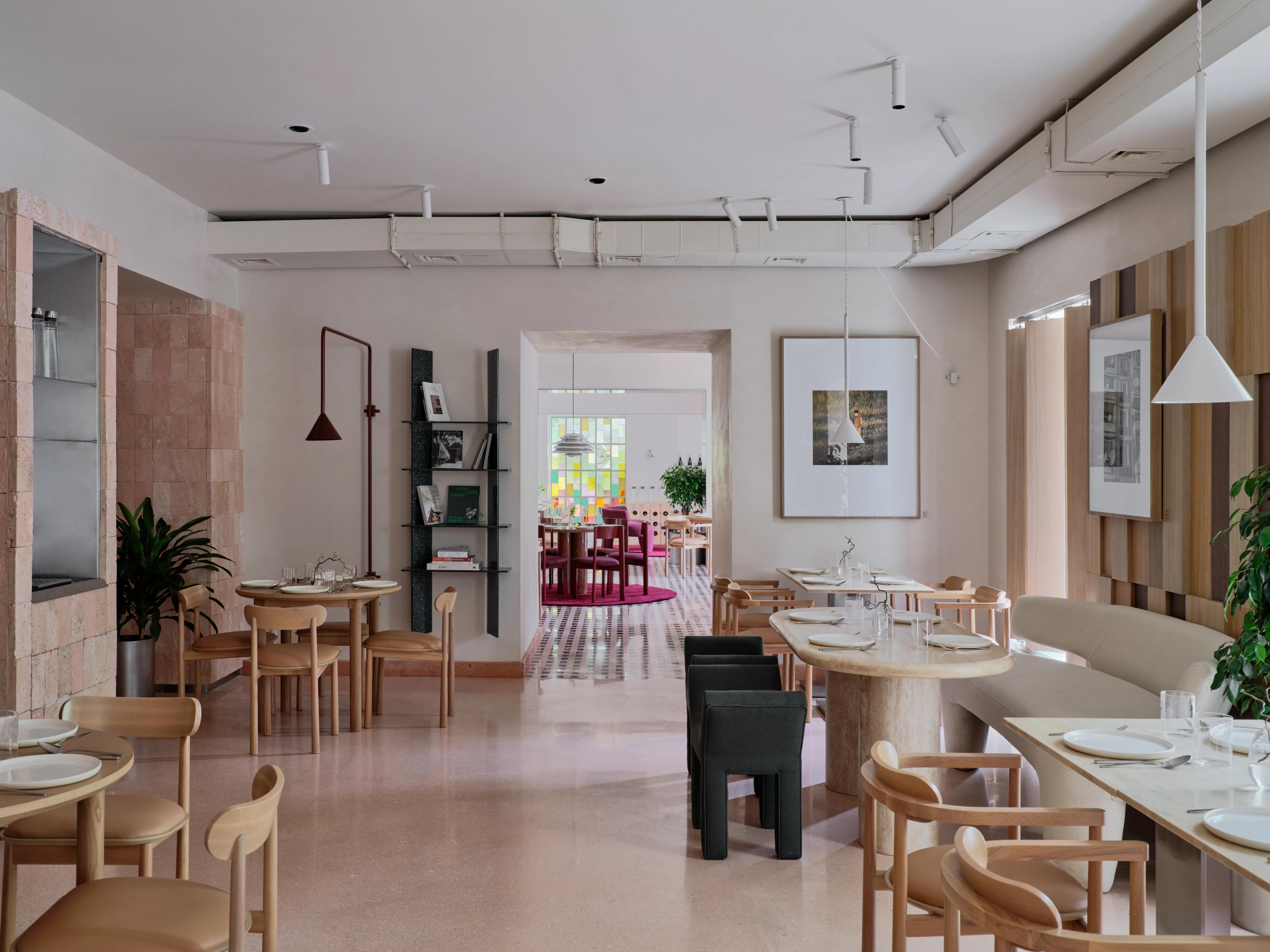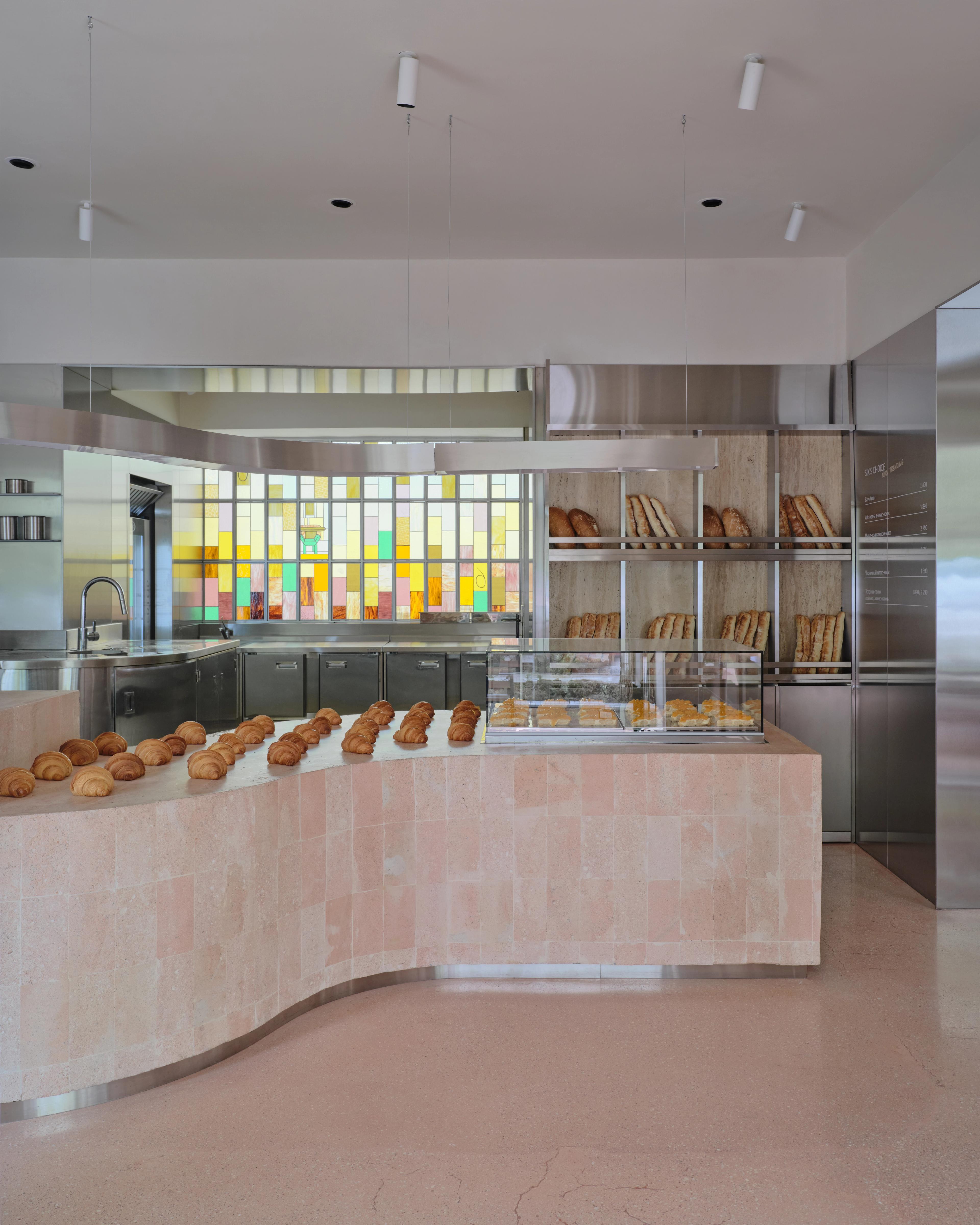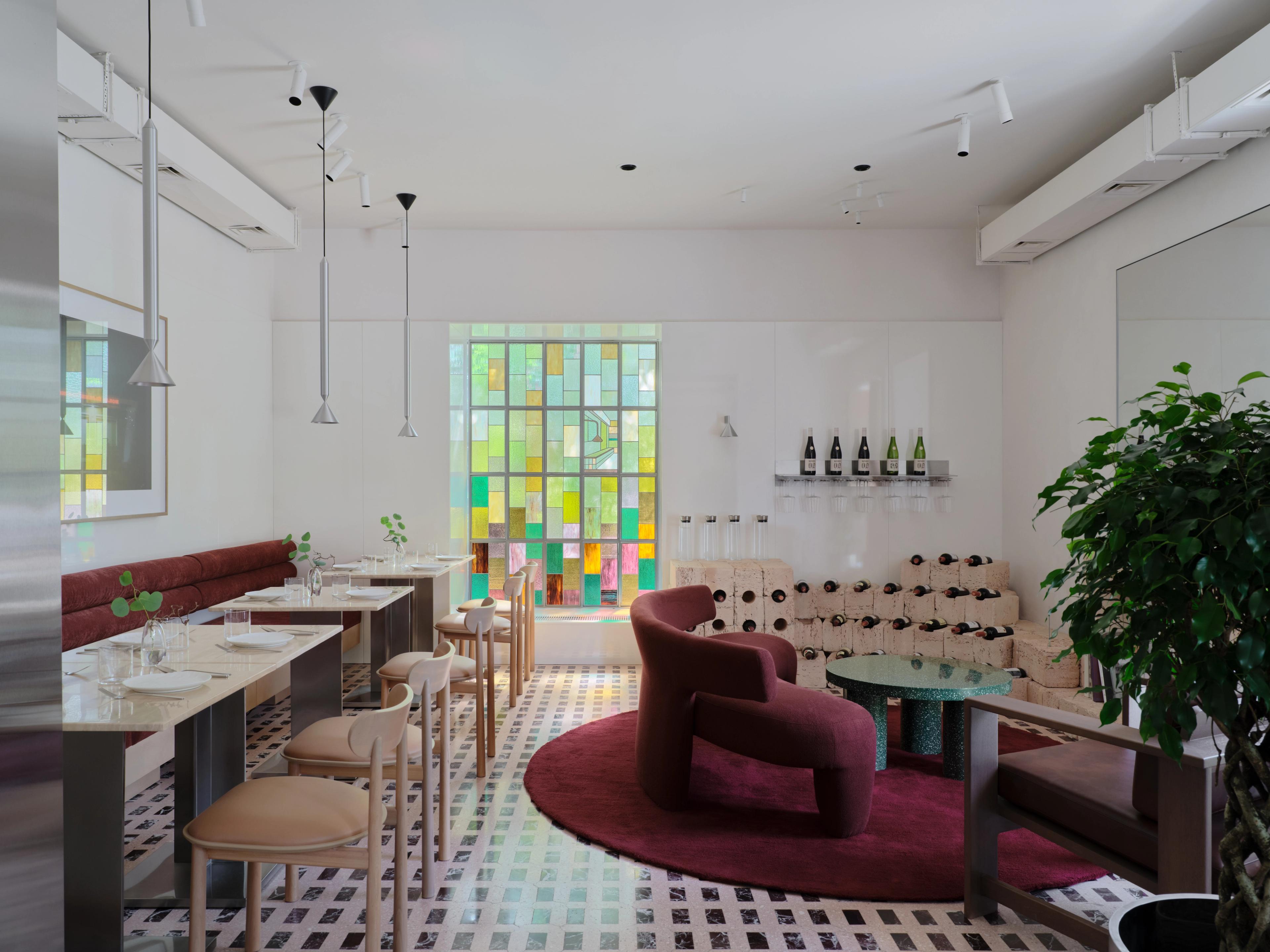 The Six Coffee + Wine restaurant is conceived as a versatile venue that seamlessly transitions from a bustling breakfast and coffee spot in the morning to an intimate winery by evening. This transformation is enabled by a meticulously planned lighting design, which adapts to create the desired ambiance, and a flexible table arrangement that shifts effortlessly between functions. Situated in a Stalin-era historical building in the heart of Almaty, the interior design pays homage to Soviet architectural traditions. Limestone cladding, terrazzo flooring, and a bespoke stained glass window crafted by a local artisan evoke the iconic aesthetic of the period, grounding the space in its cultural and historical context. A standout feature is the gradient wall panels in the corridor, a creative collaboration between the NAAW architectural studio and local furniture manufacturer Free-Style. This installation adds a dynamic, contemporary layer to the design, juxtaposing tradition with modern touch.