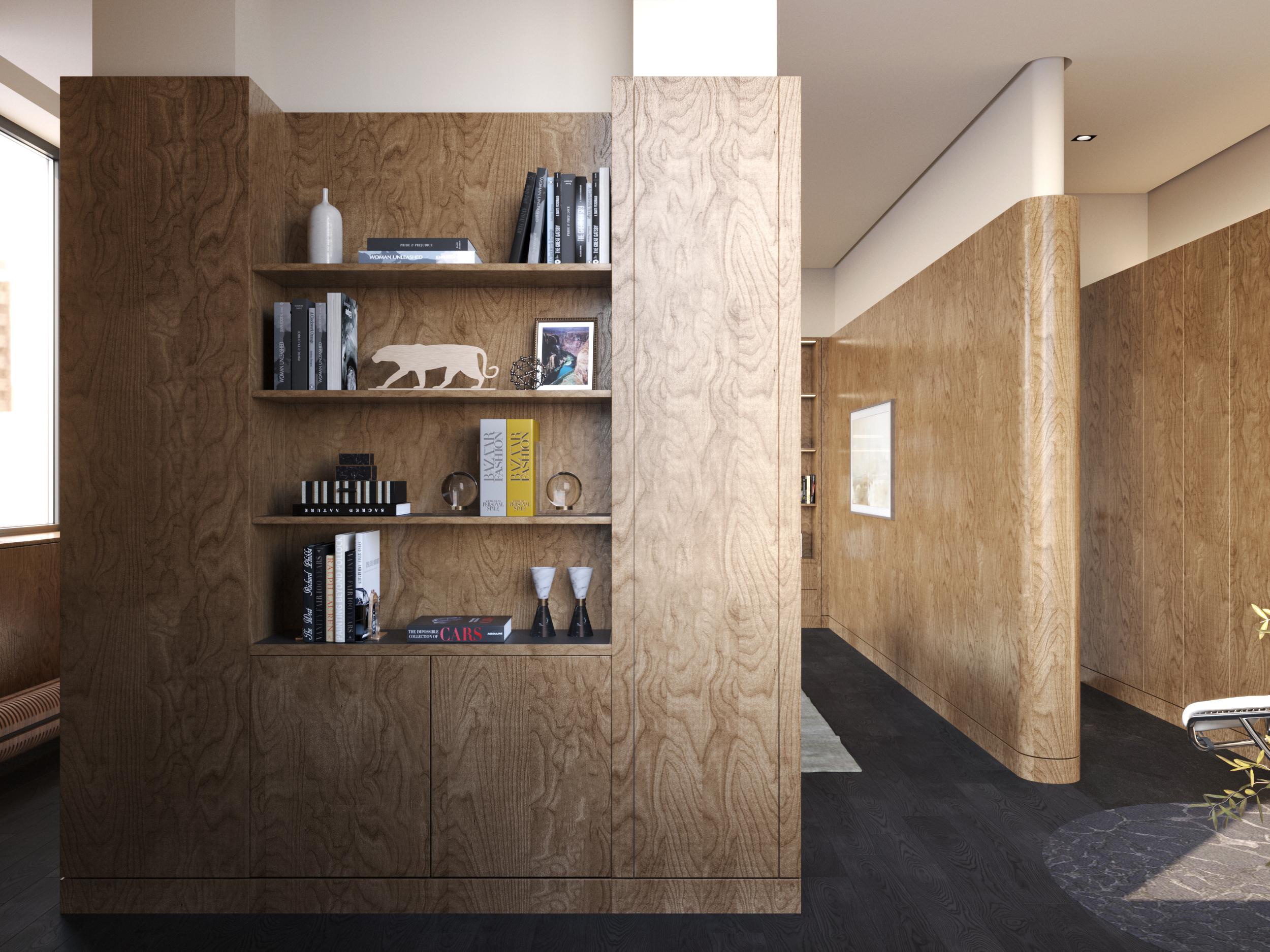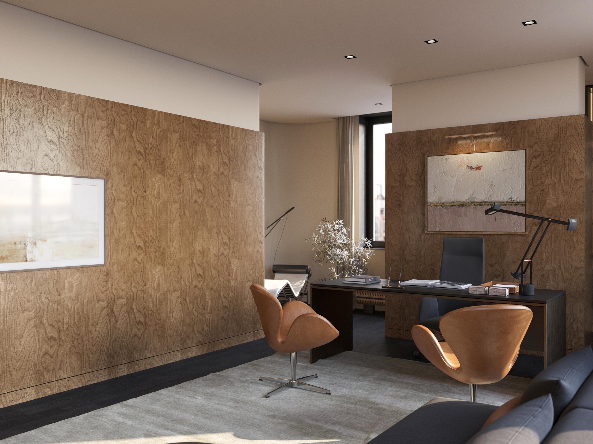 In the executive office we have tried to make a contemporaryreference to the midcentury style - the wood panelling, leather, iconic pieces of furniture. A partition behind the desk hides a column in the middle of the room, giving it additional spatial and functional value. There is a private area with a cloakroom, WC and a corner with a daybed for relaxing.