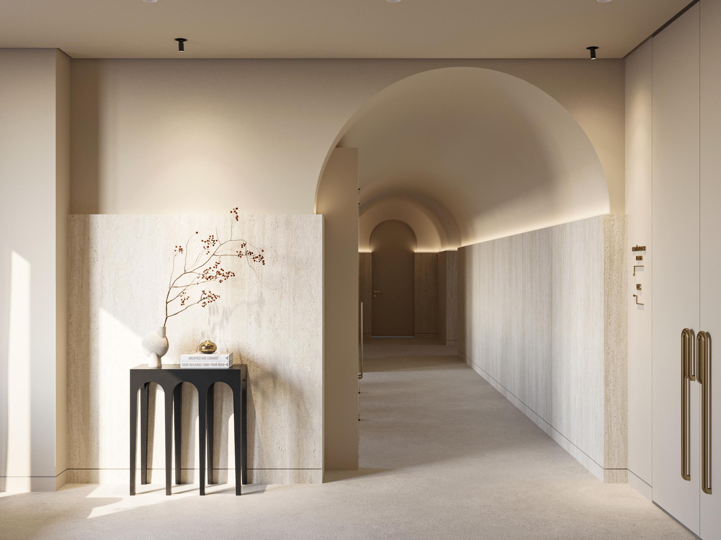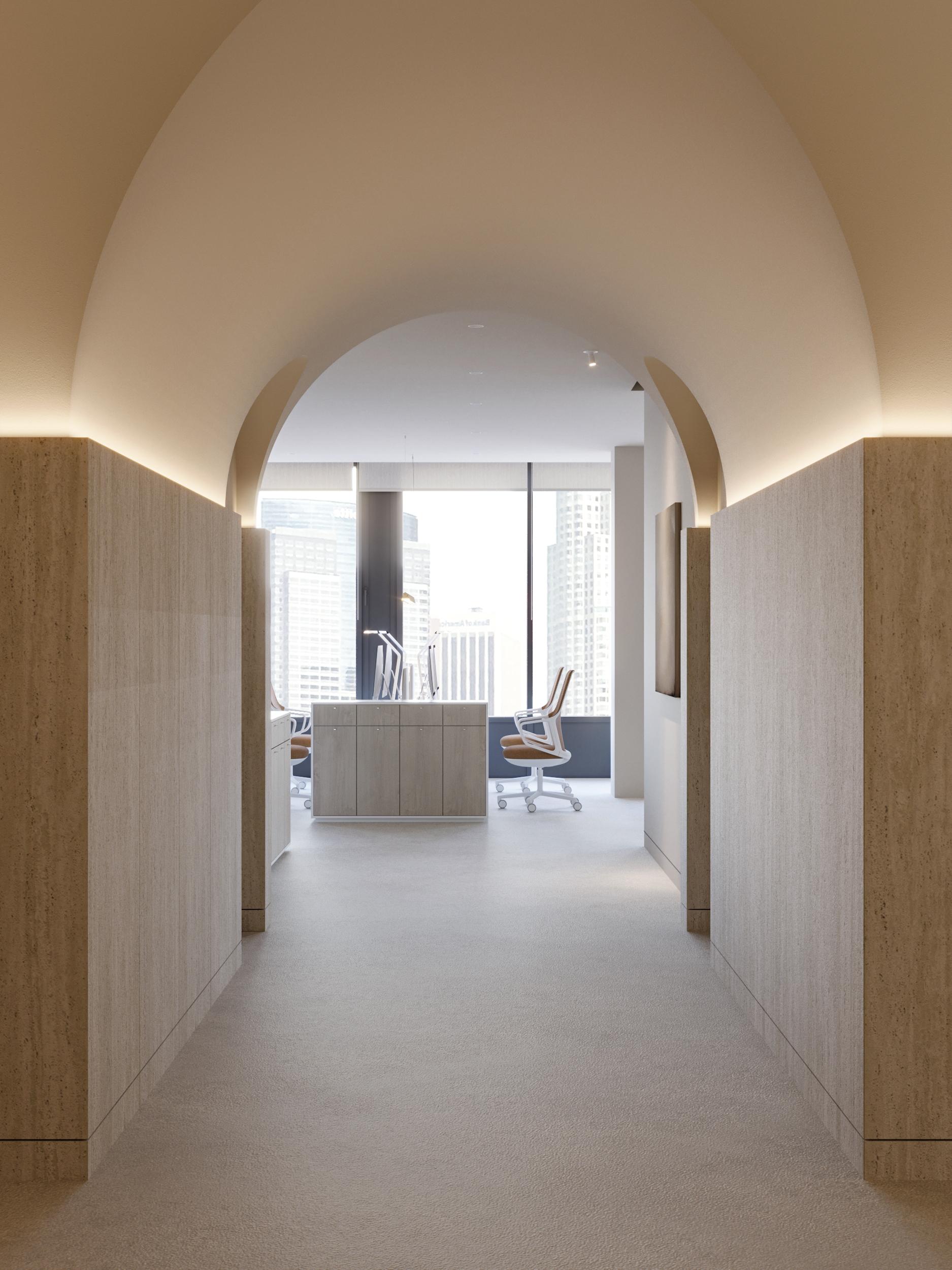The concept is based on the idea of creating a bright space for comfortable work and meeting with partners. At the head of the concept is a generous amount of air, a delicate, understated yet high end style. The few corridors are resolved by arches, to make travelling from one end of the office to the other more pleasant. The walls of the common space are stone veneer, the floors are done in concrete flooring.